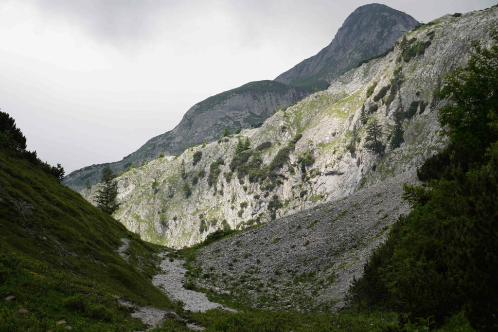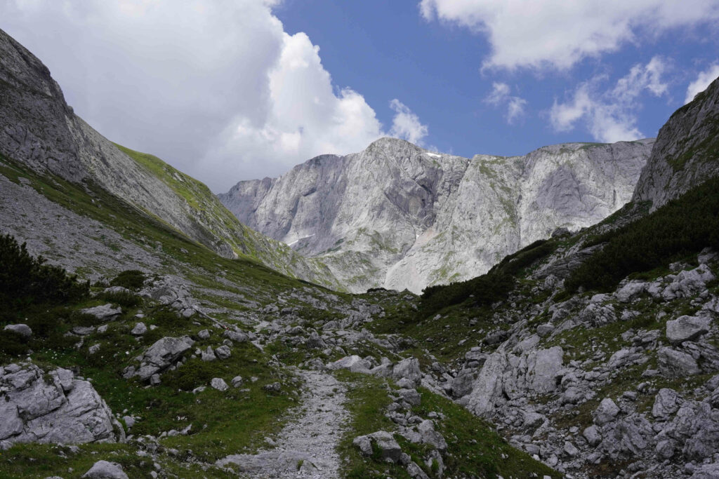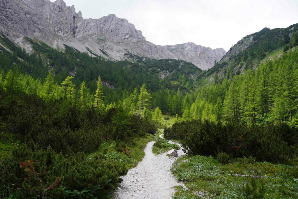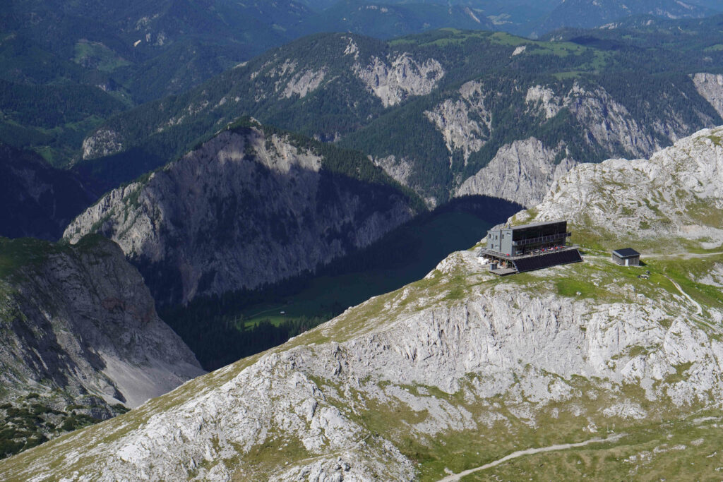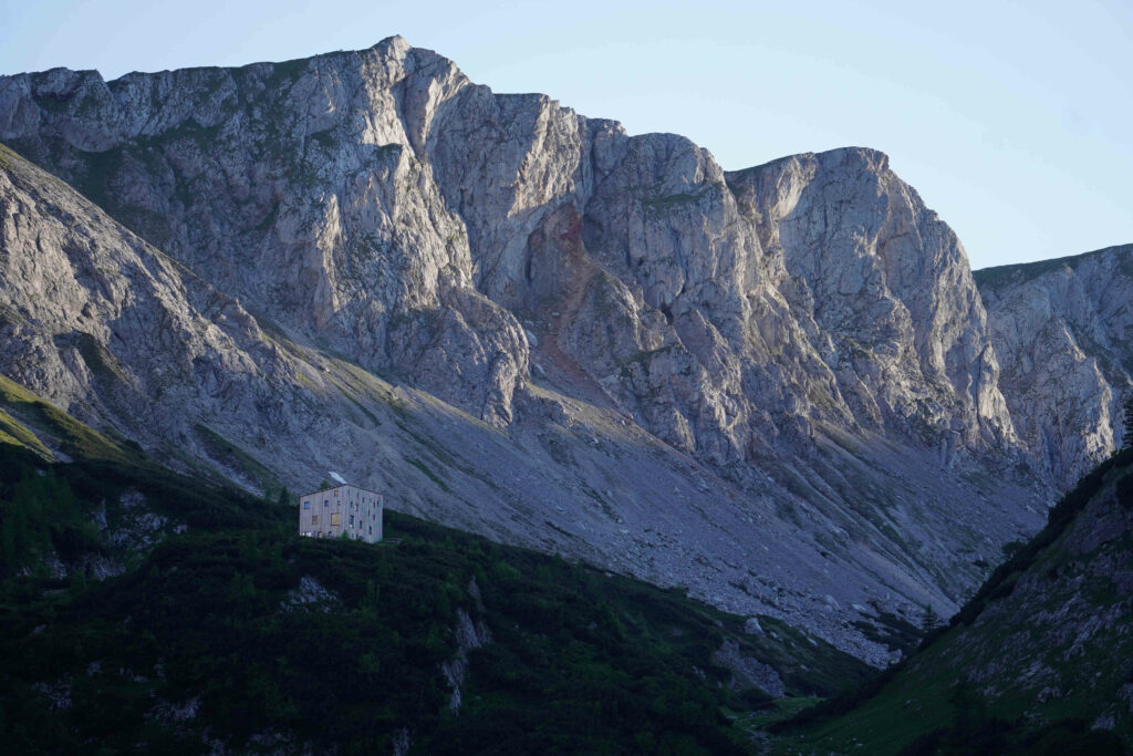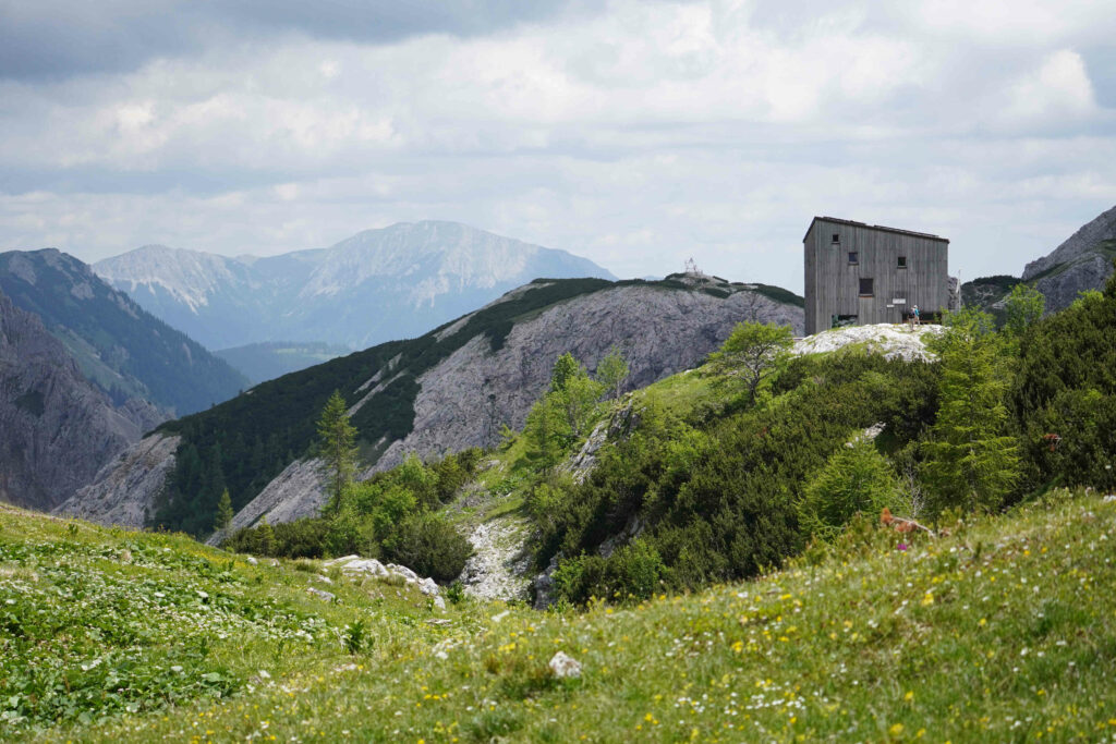 Tuż za przełęczą otwiera się nam widok wapiennej dolinki zaklętej między ścianami, na drugim końcu której na brzegu skarpy, lśni się drewniana bryła schroniska. To do niego z dna doliny dociera techniczna kolejka linowa. Pierwsze idziemy niemal po płaskim dolinką, potem stromo do góry do rozdroża nieco pod schroniskiem. W lewo schronisko, w prawo – Hochschwab.