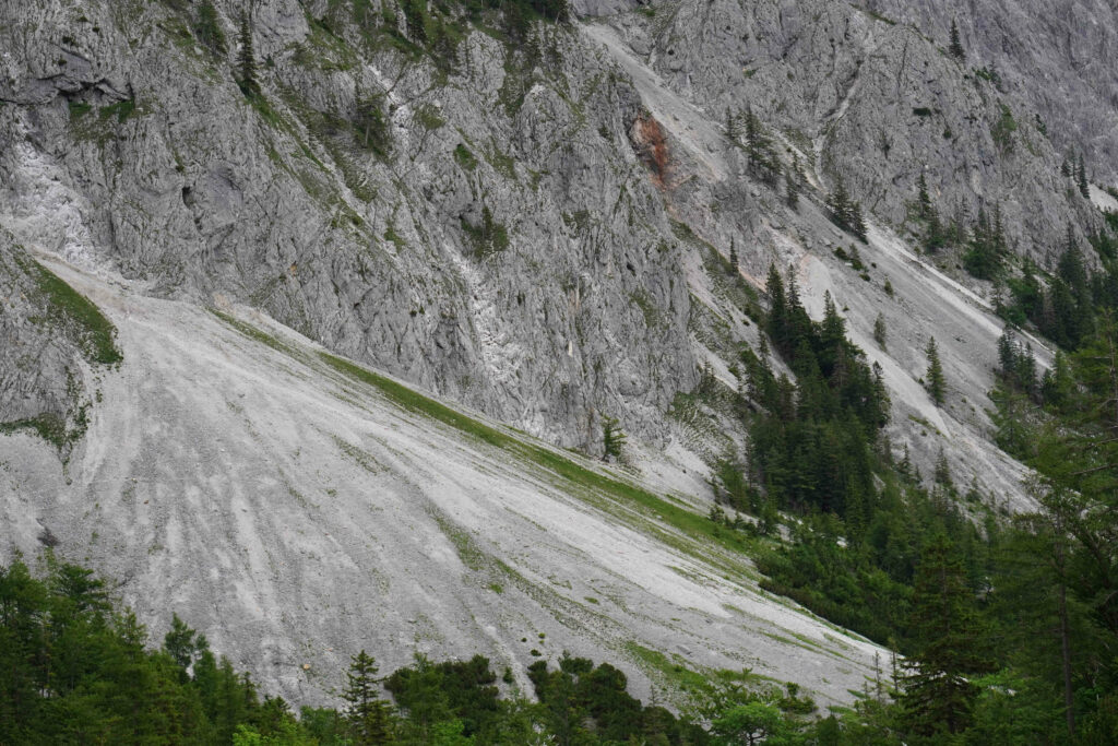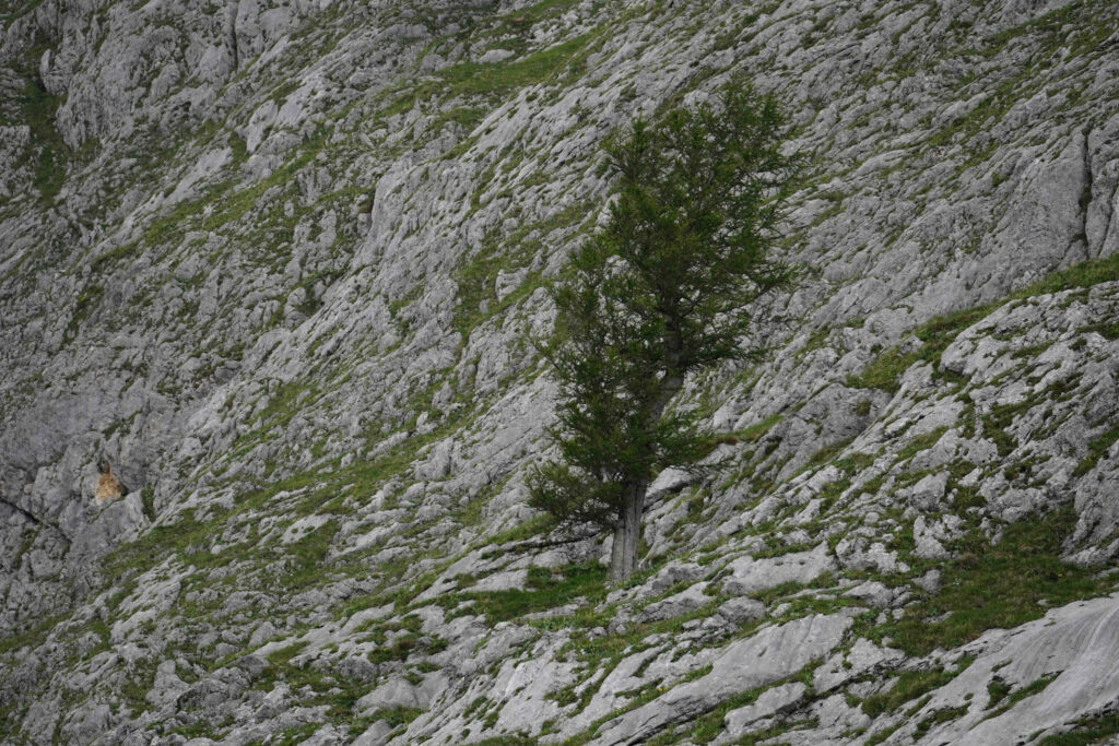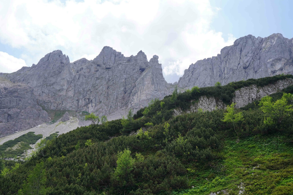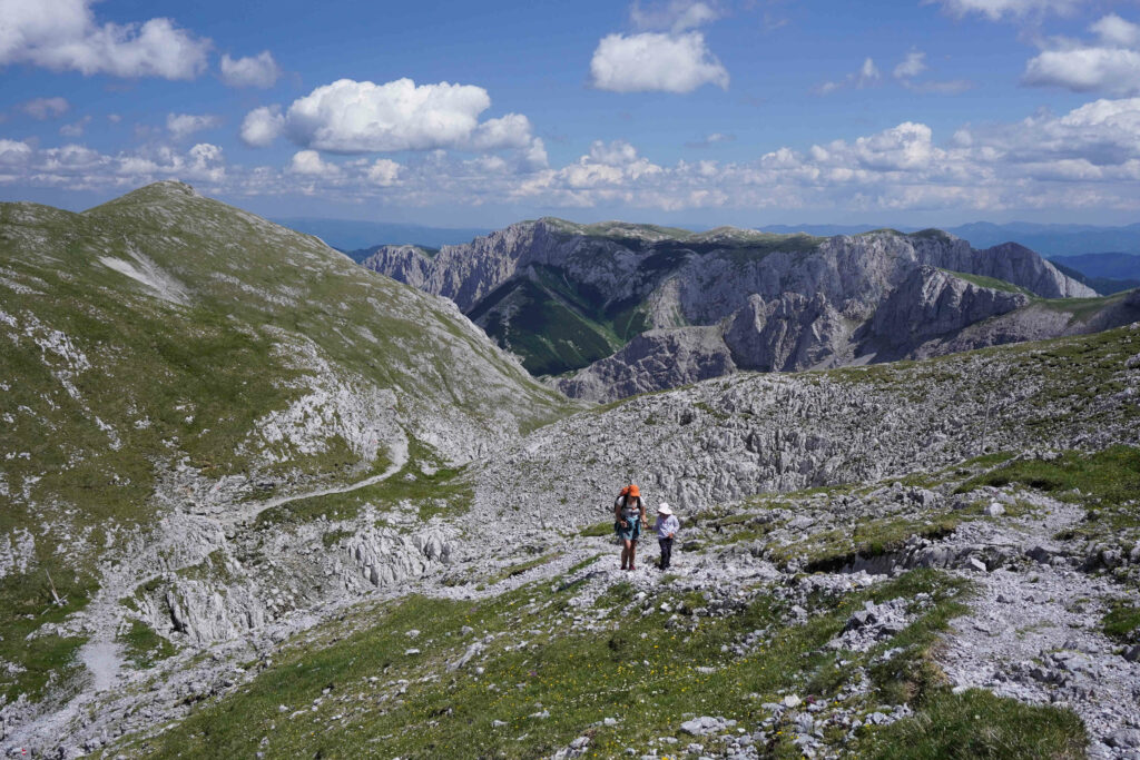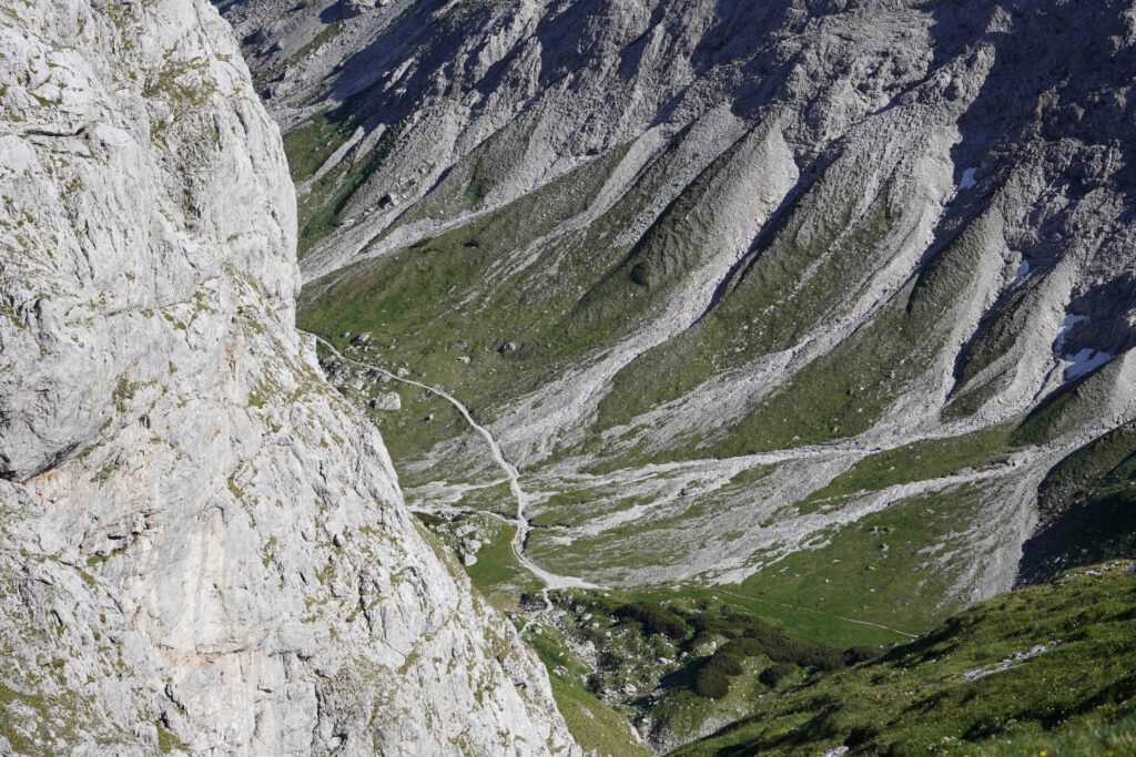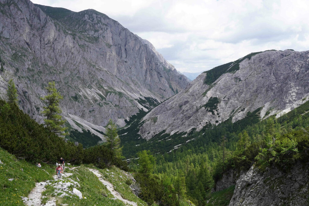 Tuż za przełęczą otwiera się nam widok wapiennej dolinki zaklętej między ścianami, na drugim końcu której na brzegu skarpy, lśni się drewniana bryła schroniska. To do niego z dna doliny dociera techniczna kolejka linowa. Pierwsze idziemy niemal po płaskim dolinką, potem stromo do góry do rozdroża nieco pod schroniskiem. W lewo schronisko, w prawo – Hochschwab.