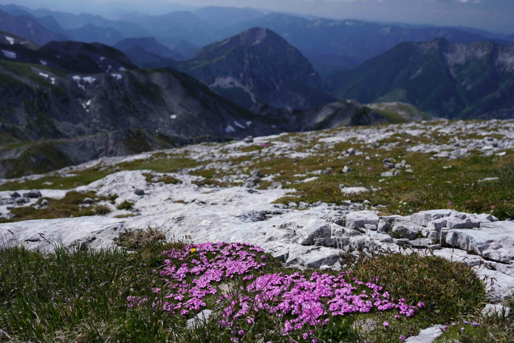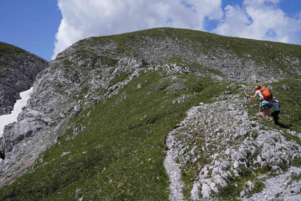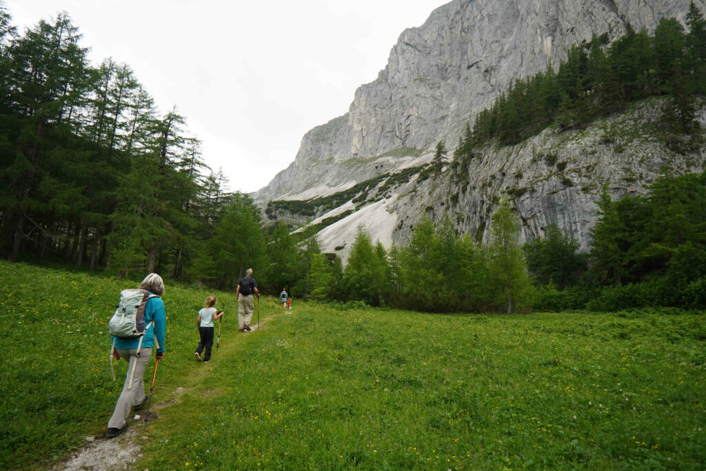 Droga meandruje koło lejów krasowych i trawersuje południowo wschodnie zbocze by po chwili wyprowadzić na sielską łąkę zawieszoną w górach. Z za zakrętu widzimy wspaniale położone Schiestlhaus (2150m), duże schronisko z pięknymi widokami, również na północ w kierunku doliny Salzy jak i PN Gesause.