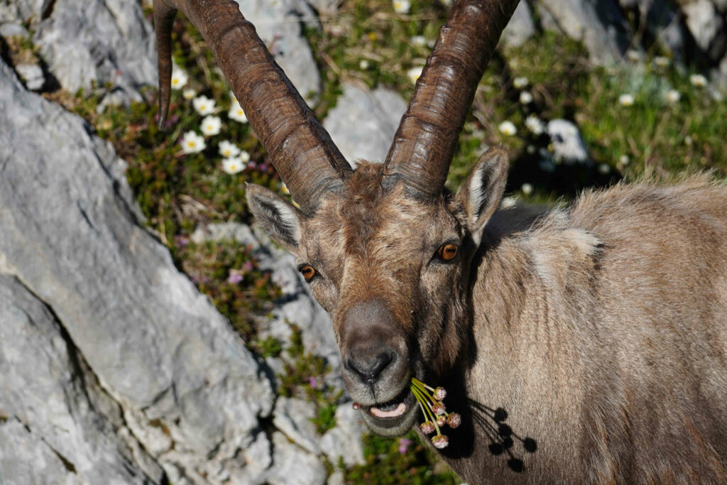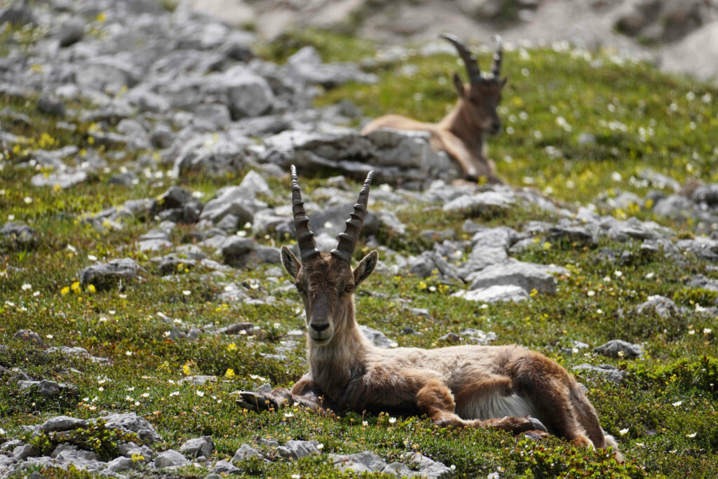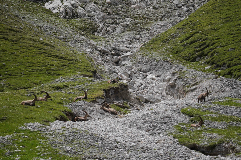 Nie widziałem dotychczas koziorożca i nie liczyłem, że spotkam go w tej części Alp. I że spotkam go tuż przy szlaku, w ilości około 50 sztuk!!! I te właśnie koziorożce spokojnie odpoczywały, zupełnie nie przestraszone turystami ruszającymi na szczyt Hochschwaba, pół godziny w górę za Voistaler Hütte (1650m).