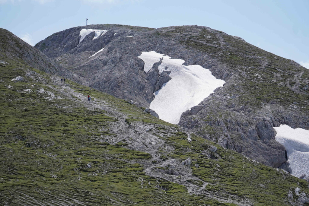 Łąką można skrócić trasę w kierunku szczytu o jakieś 200 metrów. Pierwsze idziemy zboczem Kleiner Hochschwab (2248m), w naszym przypadku po płatach śniegu, do małej rozpadliny, po pokonaniu której umiarkowanym podejściem kierujemy się w kierunku dość rozległej kopuły szczytowej do właściwego szczytu. Krzyż znajduje się nieco w stronę urwiska gdzie mamy doskonały widok na południe oraz na wschód, skąd podchodziliśmy.