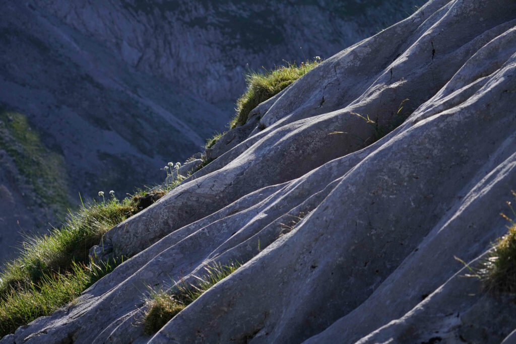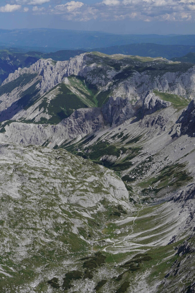 Teraz na północ, dość stromo, zdobywamy 250 metrów w pionie drogą Graf Metan Steig, wspinając się na zbocza Hochschwaba, którego ścianę i krzyż na szczycie widzimy na zachodzie. Osiągamy w ten sposób płaskowyż krasowy z licznymi lejami i otwiera się nam wreszcie szerszy widok na wschód, aż po Hoche Veitsch 1981.