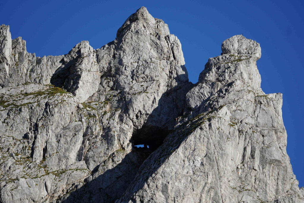 Idziemy dalej, jakby wyżej zawieszoną kontynuacją doliny. Na lewo, na południe zwraca uwagę okno skalne pod szczytem Edelspitza 1883-1867m.